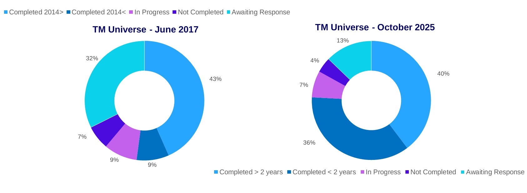 TM launched the PFMI Implementation Matrix (PIM) in July 2017 that displayed the current status of the assessment of each of the 360 FMI’s within the 106 markets that TM currently monitor. The results shown within the above map are updated on a quarterly basis. The parameters this quarter show assessments completed after 2023 and before 2023 as CPMI-IOSCO recommend that FMIs re-assess the PFMIs on an on-going basis every 2 years or when proposing new services, changes to risk controls or when material changes are made to their systems or environment. The charts below display the difference in completion rates of Self-Assessments between the beginning of the monitoring in June 2017 to today: